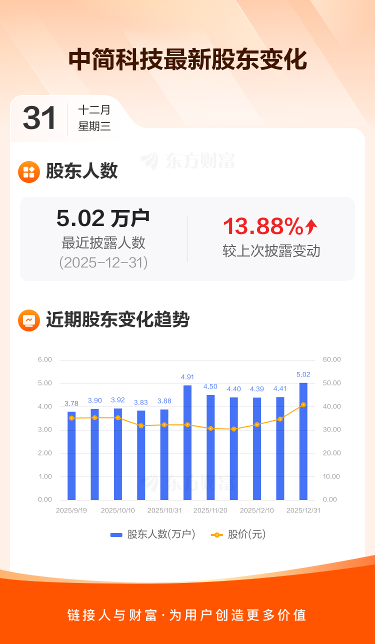 中简科技最新披露数据显示,截至12月31日公司股东户数为5.02万户,较上期(2025年12月19日)增加6117户,增幅为13.88%。户均持有流通股数量由上期的9611股下降至8440股,户均持股金额由上期的33.31万元增加至34.44万元。