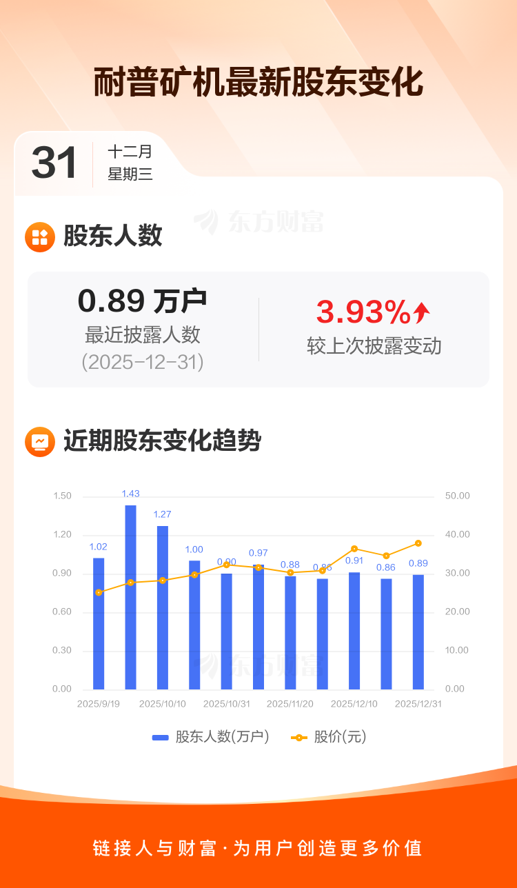 耐普矿机最新披露数据显示,截至12月31日公司股东户数为8943户,较上期(2025年12月19日)增加338户,增幅为3.93%。户均持有流通股数量由上期的1.27万股下降至1.22万股,户均持股金额由上期的44.05万元增加至46.36万元。