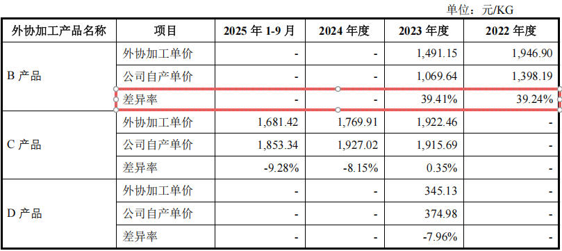 记者注意到,同样是“B产品”,以2023年为例,九目化学自产单价为1069.64元/公斤,外协加工给万润股份却支付1491.15元/公斤,差异率超过39%。