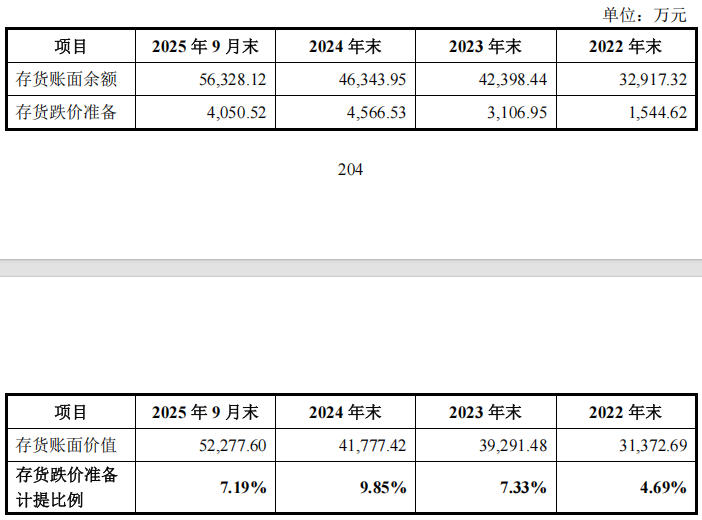 报告期各期末,公司存货账面价值分别为3.14亿元、3.93亿元、4.18亿元以及5.23亿元,占流动资产的比例分别为58.58%、66.22%、66.78%以及71.41%,占比较高。