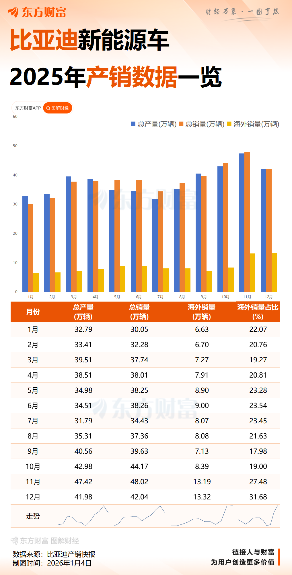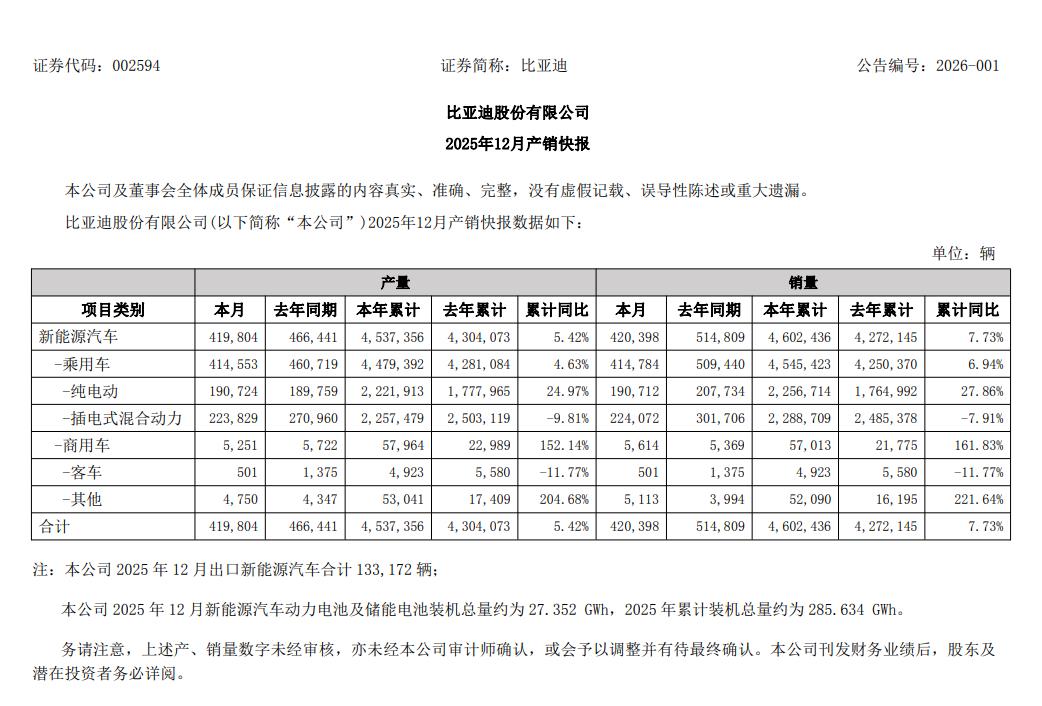1月4日,比亚迪(002594.SZ)公告称,比亚迪发布2025年12月产销快报,2025年全年累计销售新能源汽车460.2万辆,同比增长7.73%;其中乘用车销量为454.5万辆,同比增长6.94%,商用车销量为57,013辆,同比增长161.83%。纯电动车型累计销量达225.67万辆,同比增长27.86%;插电式混合动力车型累计销量为229万辆,同比下降7.91%。公司2025年12月新能源汽车动力电池及储能电池装机总量约为27.352GWh,2025年累计装机总量约为285.634GWh。
