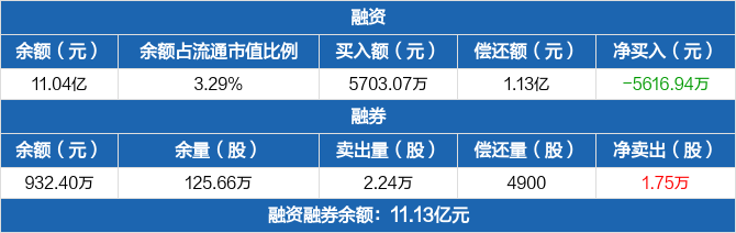融资方面,当日融资买入5703.07万元,融资偿还1.13亿元,融资净偿还5616.94万元。融券方面,融券卖出2.24万股,融券偿还4900股,融券余量125.66万股,融券余额932.4万元。融资融券余额合计11.13亿元。