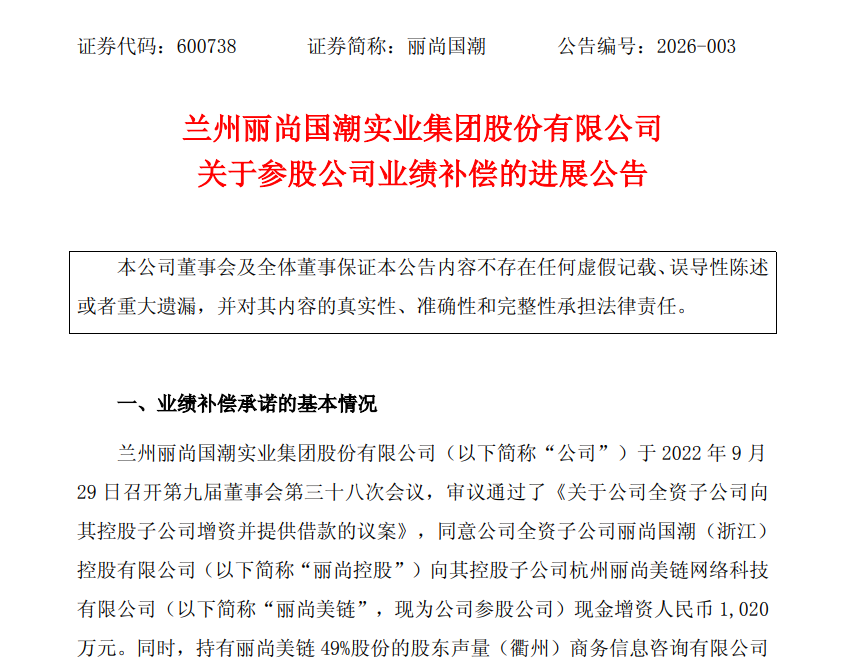1月4日盘后,丽尚国潮(600738)公告披露,参股公司杭州丽尚美链的股东在2025年12月31日前,通过提前偿还由公司担保的银行借款,把丽尚国潮及子公司丽尚控股的风险敞口一次性压降2000万元。