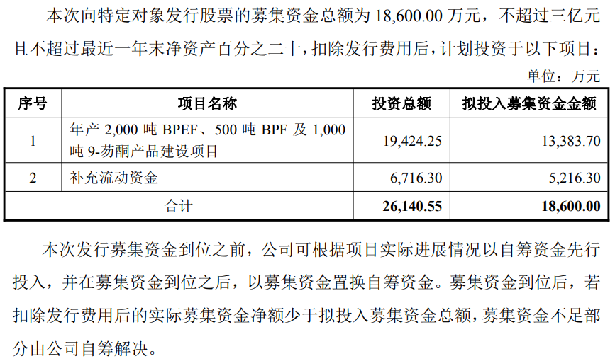 本次发行募集资金拟用于“年产2,000吨BPEF、500吨BPF及1,000吨9-芴酮产品建设项目”,以及补充流动资金。项目预期建设工期24个月。经测算,本项目投资税后财务内部收益率为20.14%,项目投资税后静态投资回收期为5.81年(含建设期)。