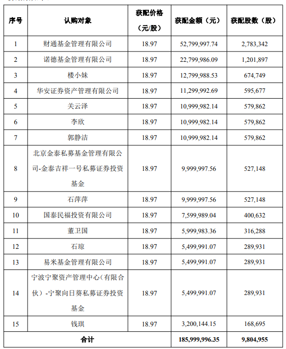 从获配情况来看,财通基金获配金额最高,达52,799,997.74元,获配股数2,783,342股。诺德基金紧随其后,获配22,799,986.09元,获配股数1,201,897股。此外,楼小妹、华安证券资管公司等机构和个人投资者也参与了本次认购。