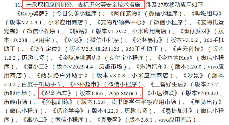 其中,因未采取相应的加密、去标识化等安全技术措施,深蓝汽车APP被通报。