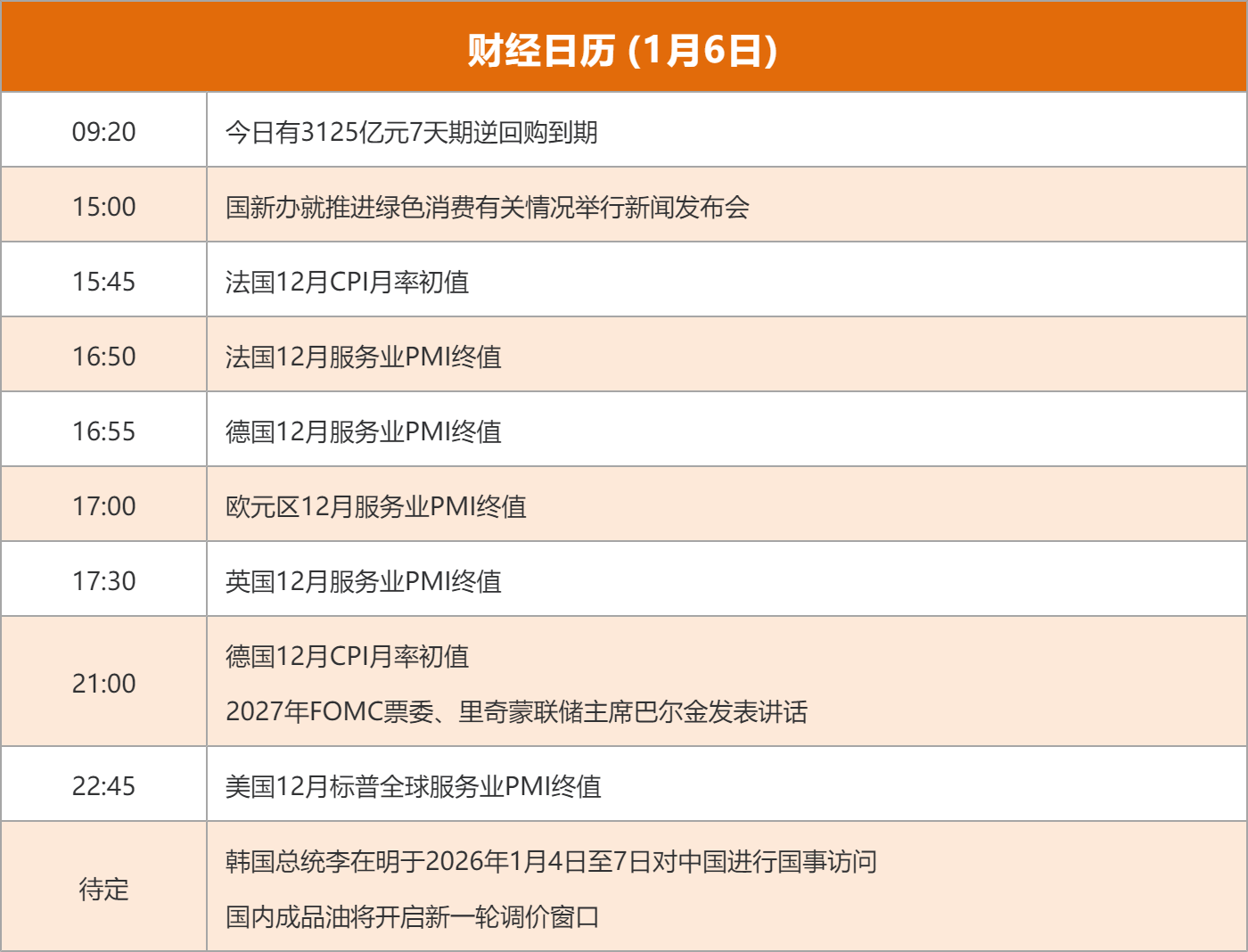 国内期货:1月5日,国内商品期货收盘涨跌不一,钯涨超8%,碳酸锂涨超7%,铂涨超6%,苹果、铝合金涨超4%,沪铝、沥青涨近4%,国际铜涨超3%,沪铜、沪锡、多晶硅涨超2%。跌幅方面,烧碱、原油、焦煤跌超3%,焦炭跌近3%,纯碱、乙二醇跌超2%。