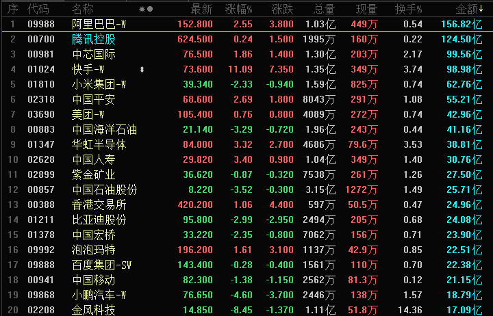 盘面上,大型科技股走势分化,快手大涨11%表现尤其抢眼;生物医药股集体活跃,平安好医生领衔互联网医疗股上涨;内房股拉升,脑机接口概念大爆发。汽车股全天低迷,三桶油集体下跌,内银股走低。