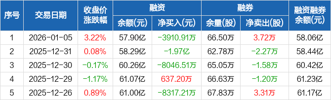 华泰证券融资融券信息显示,2026年1月5日融资净偿还3910.91万元;融资余额57.9亿元,创近一年新低,较前一日下降0.67%。