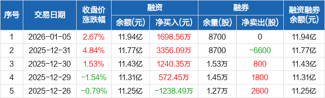 融资方面,当日融资买入2.04亿元,融资偿还1.87亿元,融资净买入1698.56万元,连续4日净买入累计6867.46万元。融券方面,融券卖出0股,融券偿还0股,融券余量8700股,融券余额22.44万元。融资融券余额合计11.94亿元。