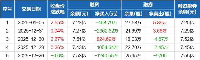 智度股份融资融券信息显示,2026年1月5日融资净偿还468.79万元;融资余额7.23亿元,较前一日下降0.64%
