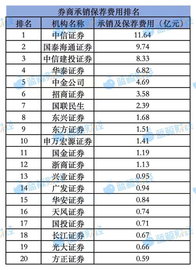 而从2025年券商承销及保荐费用来看,前5名则分别为中信证券、国泰海通证券、中信建投证券、华泰证券、中金公司,承销保荐费用分别为11.64亿元、9.74亿元、8.33亿元、6.82亿元、4.69亿元。另有有19家券商该项收入不足1亿元。