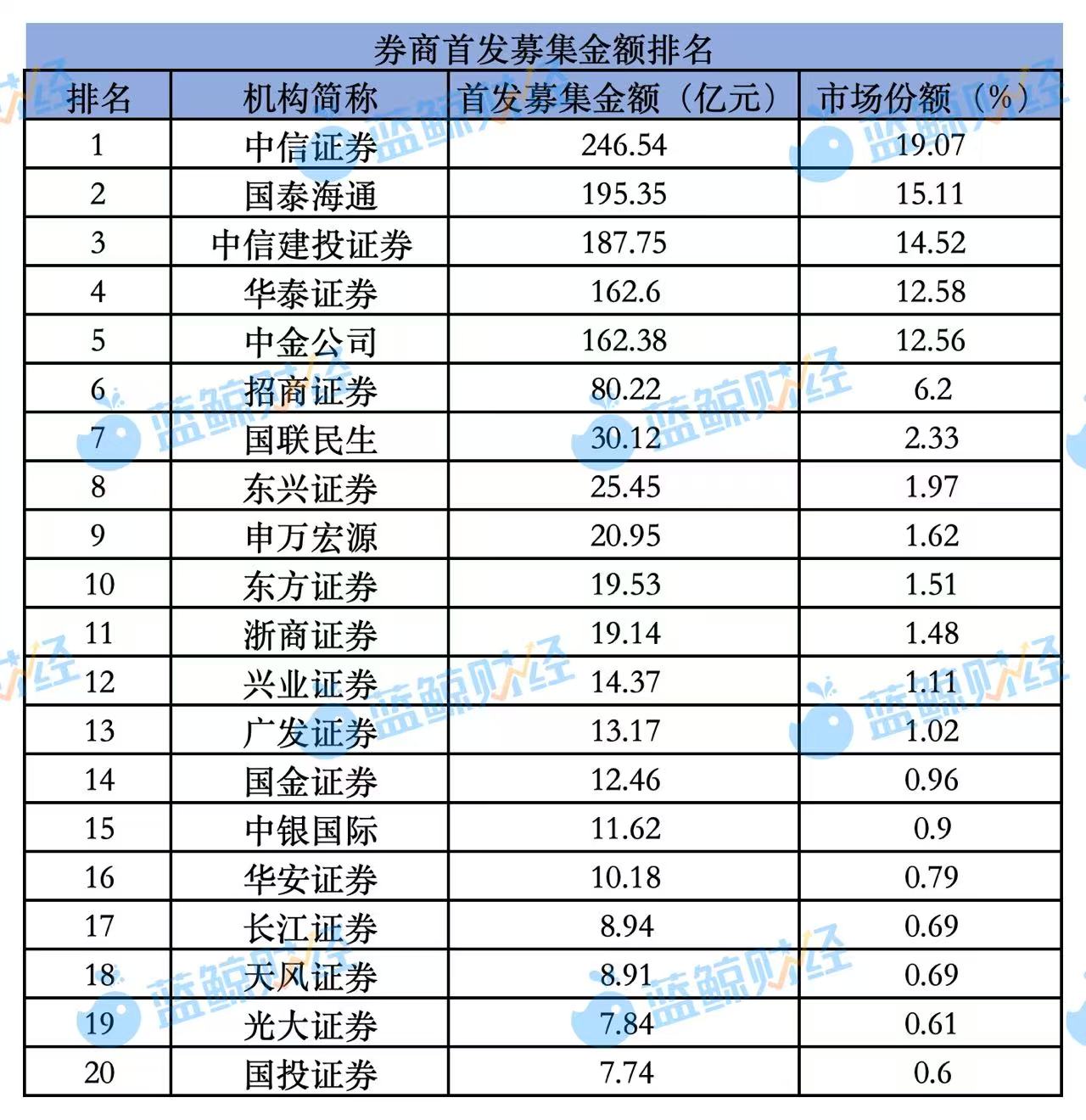事实上,此次IPO总量的增长与头部券商的带动密不可分。从券商承销金额排名来看,前五名分别为中信证券、国泰海通、中信建投、华泰证券、中金公司,募集资金分别为246.54亿元、195.35亿元、187.73亿元、162.6亿元、162.38亿元,市场份额分别为19.07%、15.11%、14.52%、12.58%、12.56%。
