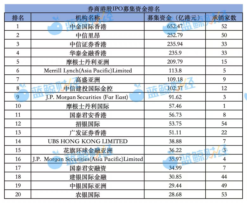 从募集资金来看,只有中金国际香港、中信里昂、中信证券香港、华泰金融、摩根士丹利,5家券商的港股IPO募集资金超过200亿港元,分别为652.47亿港元、252.79亿港元、235.94亿港元、235.90亿港元、209.79亿港元。