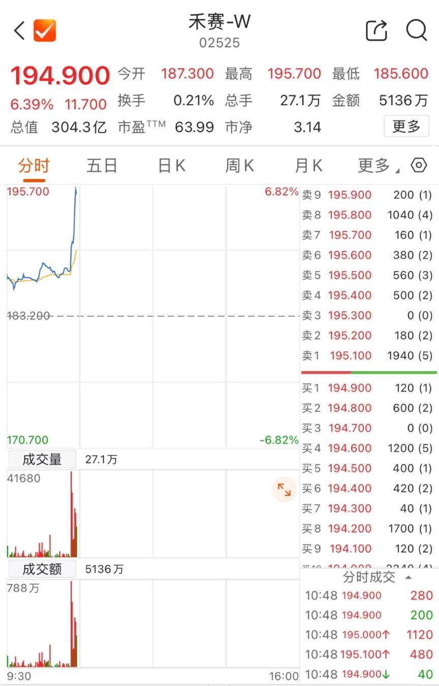 1月6日早盘,禾赛科技港股盘中直线拉升,截至发稿涨6.39%,报194.9港元/股。