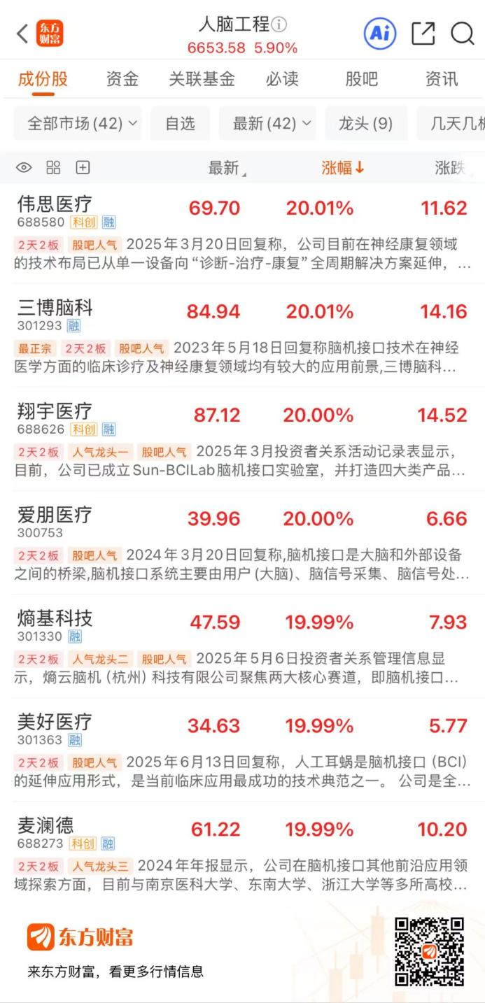 继昨日板块暴涨13%后,A股人脑工程板块1月6日继续走高,板块内再掀涨停潮。
