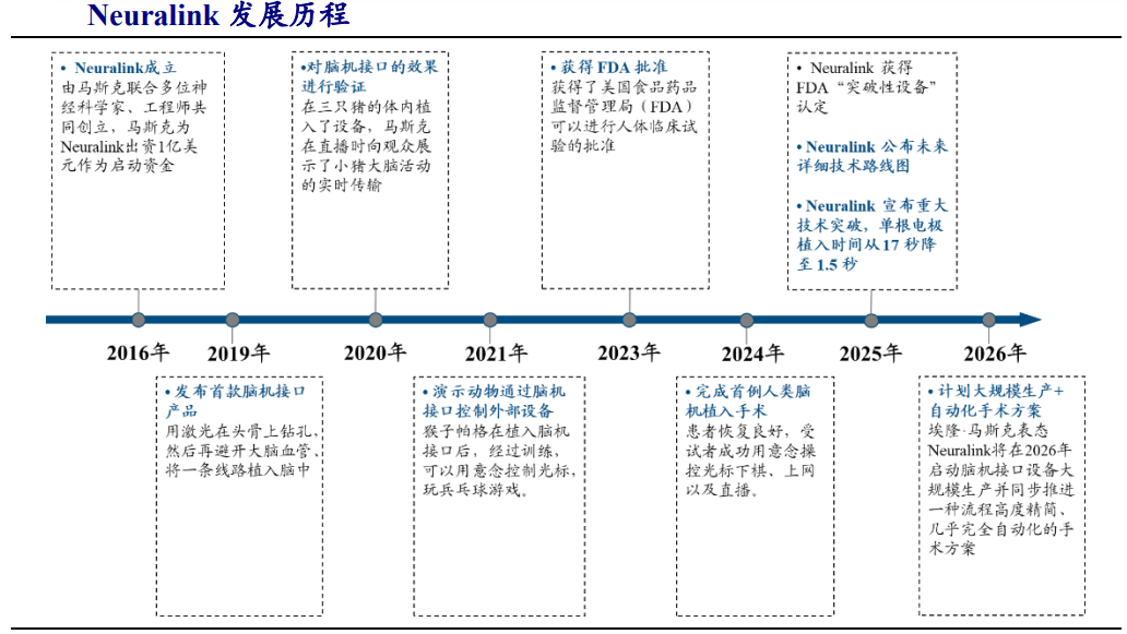 资料显示,Neuralink是一家侵入式脑机接口企业,旨在开发能够植入人脑的设备,实现人与机器之间的交互,解决医疗康复痛点并探索未来人机融合场景。Neuralink成立于2016年,由马斯克联合多位神经科学家、工程师共同创立。截至2025年已完成多例人体植入手术,并不断拓展技术应用场景。