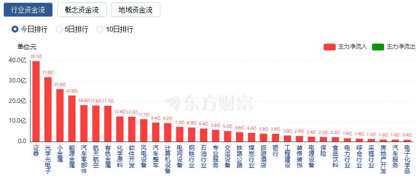 行业资金方面,截至收盘,证券、光学光电子、小金属等净流入排名靠前,其中证券净流入39.73亿。
