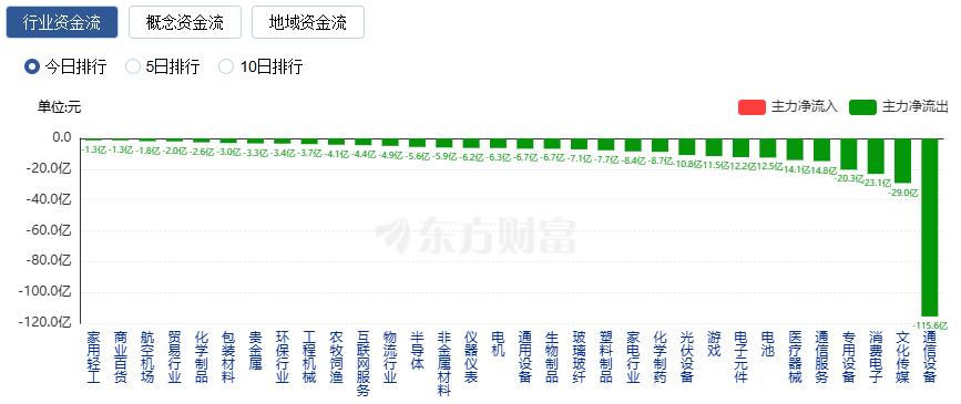 净流出方面,通信设备、文化传媒、消费电子等净流出排名靠前,其中通信设备净流出115.6亿元。