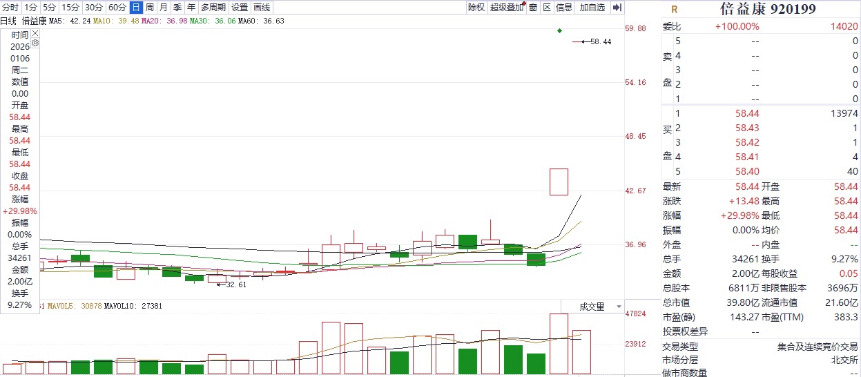 在一众强势概念股中,川股倍益康的表现最为抢眼。1月5日,倍益康大幅高开后几笔大单便将股价封死在涨停板上,成交量明显放大。1月6日该股表现更为抢眼,直接收出“一”字涨停板。短短两个交易日,倍益康累计涨幅高达68.95%,强势领涨脑机接口概念板块。