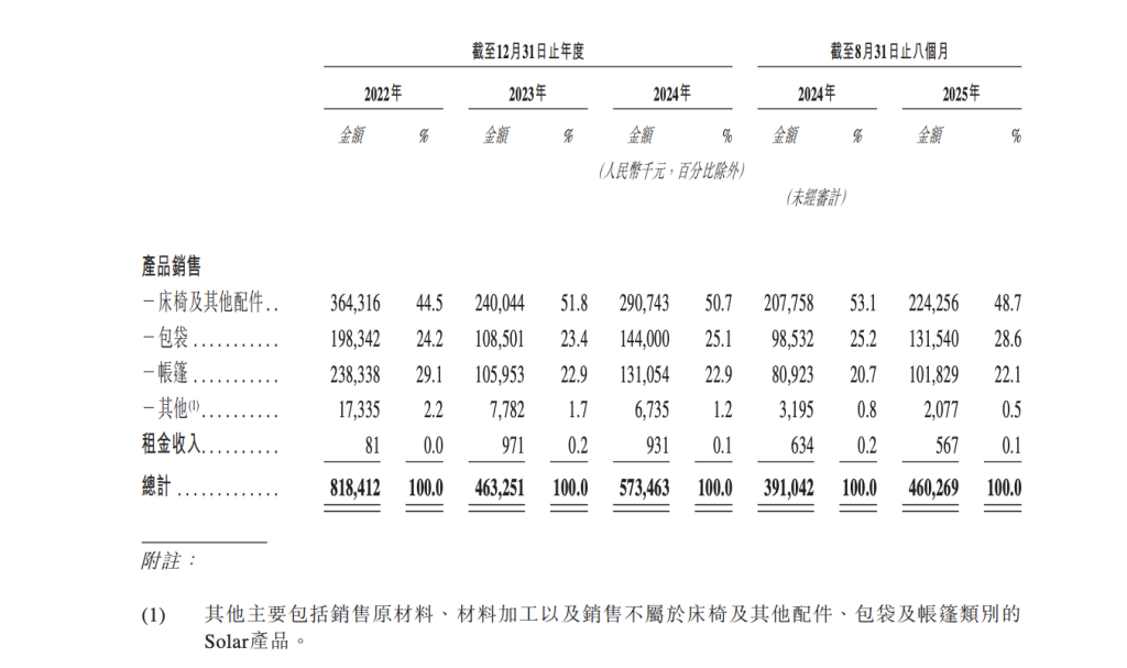 从业绩表现来看,乐欣户外的收入在2023年出现明显下滑。数据显示,2022年至2024年,其收入分别为8.18亿元、4.63亿元、5.73亿元;截至2025年8月31日止八个月,乐欣户外的收入为4.60亿元。
