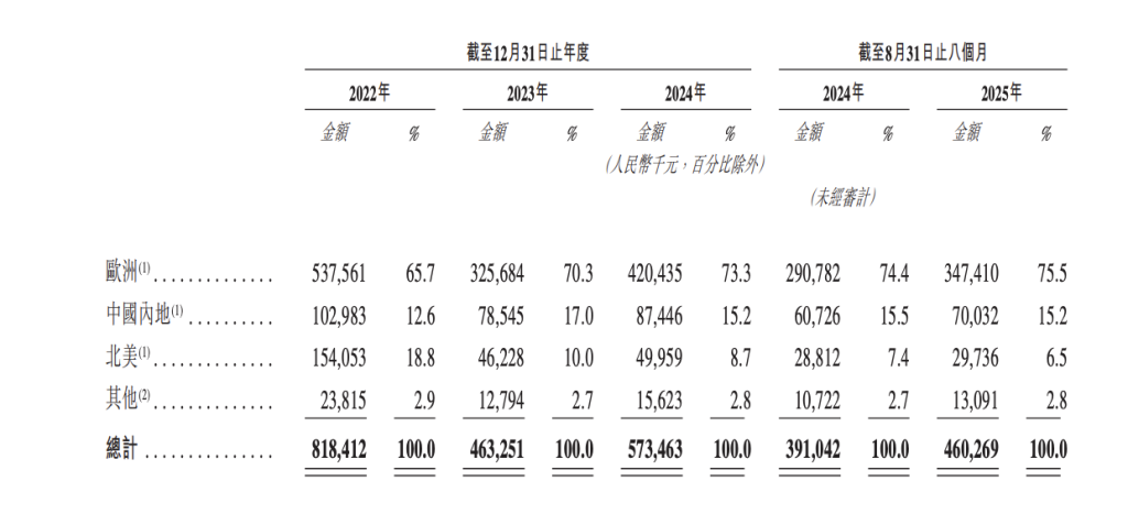 市场布局方面,乐欣户外的产品销往欧洲、中国内地及北美等40多个国家及地区。2022年至2025年前八个月,其海外市场收入分别为7.154亿元、3.847亿元、4.86亿元及3.902亿元,占比分别为87.4%、83.0%、84.8%及84.8%。乐欣户外坦言,国际业务面临国际贸易政策、贸易保护措施、地缘政治及关税相关等合规与监管风险。