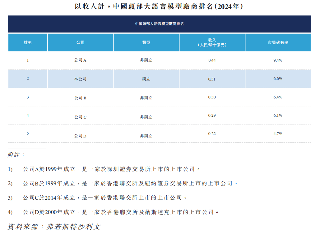 引人深思的是,上述排名与招股书引用的弗若斯特沙利文榜单,因统计口径差异形成鲜明对比。2024年中国大语言模型市场规模53亿元,前五名份额总和为33%;其中,智谱AI以3.1亿元的收入,位列第二,排在科大讯飞(002230.HK,4.4亿元)之后及阿里(3亿元)、商汤(2.9亿元)、百度(2.2亿元)之前。