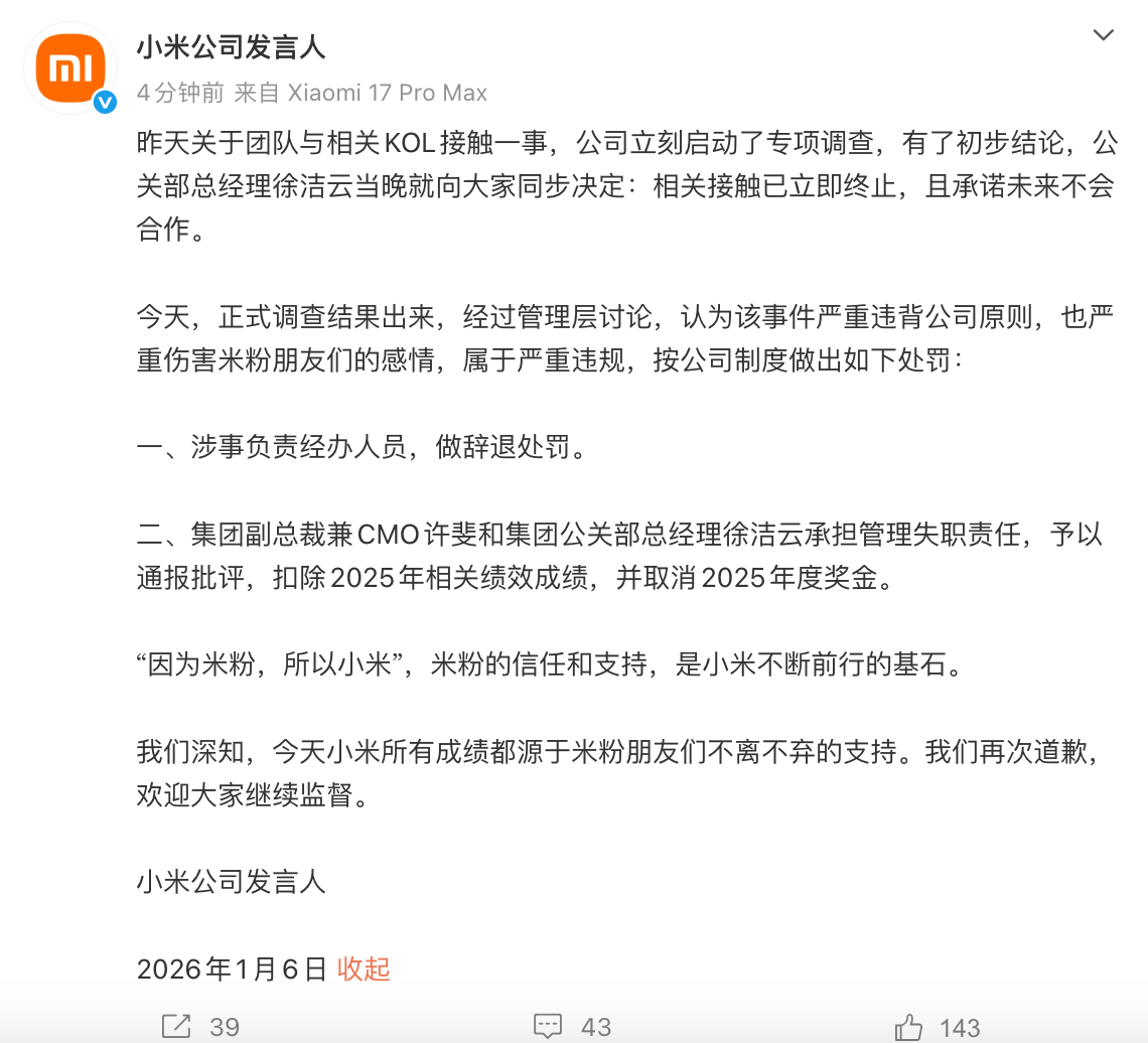 人民财讯1月6日电,小米公司发言人1月6日晚发文称,昨天关于团队与相关KOL接触一事,公司立刻启动了专项调查,有了初步结论,公关部总经理徐洁云当晚就向大家同步决定:相关接触已立即终止,且承诺未来不会合作。今天,正式调查结果出来,经过管理层讨论,认为该事件严重违背公司原则,也严重伤害米粉朋友们的感情,属于严重违规,按公司制度做出如下处罚:一、涉事负责经办人员,做辞退处罚。二、集团副总裁兼CMO许斐和集团公关部总经理徐洁云承担管理失职责任,予以通报批评,扣除2025年相关绩效成绩,并取消2025年度奖金。