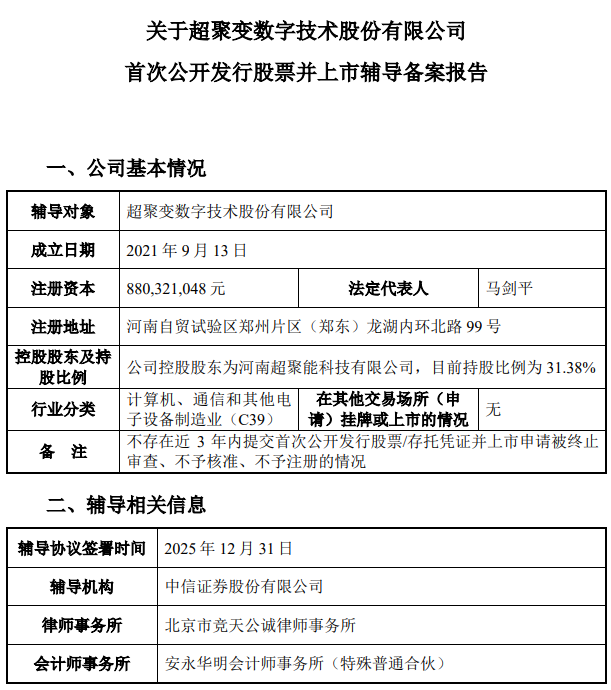 1月6日,证监会官网披露,超聚变数字技术股份有限公司已正式启动上市辅导,中信证券担任辅导机构。