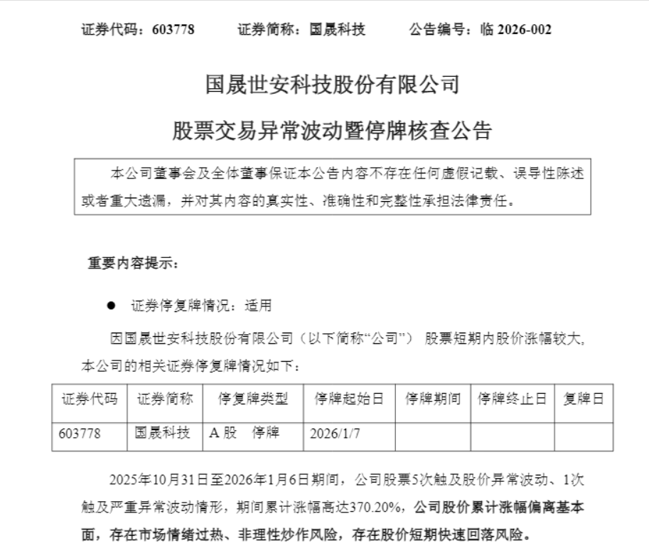 国晟科技最新公告称,2025年10月31日至2026年1月6日期间,公司股票5次触及股价异常波动、1次触及严重异常波动情形,期间累计涨幅高达370.20%,公司股价累计涨幅偏离基本面,存在市场情绪过热、非理性炒作风险,存在股价短期快速回落风险。