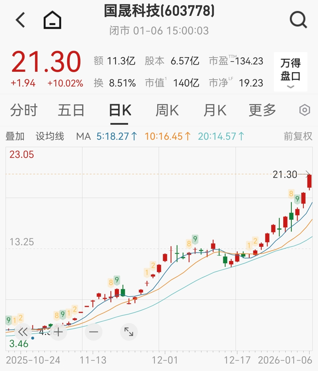 盘面上,截至今日收盘,国晟科技报收21.30元/股,总市值140亿元,公司股价自2025年10月13日走强以来,期间累计涨幅超512%。