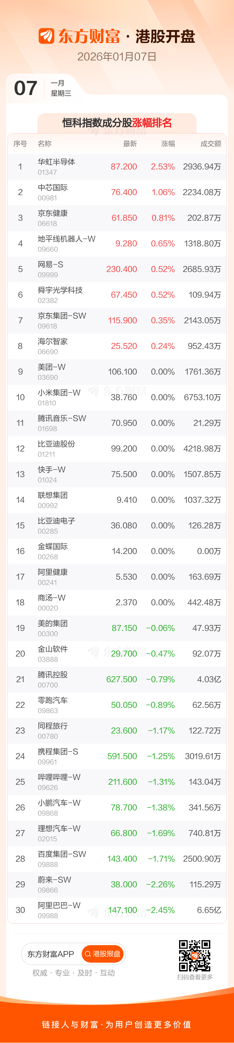 1月7日港股开盘:恒指低开0.41% 阿里巴巴-W领跌成分股
