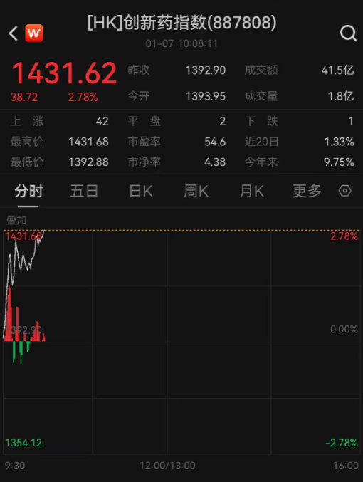 上证报中国证券网讯(记者何漪)1月7日,港股创新药板块表现活跃。截至10时08分,港股创新药指数上涨2.78%;乐普生物-B、康方生物、恒瑞医药H股、凯莱英H股均涨超4%。