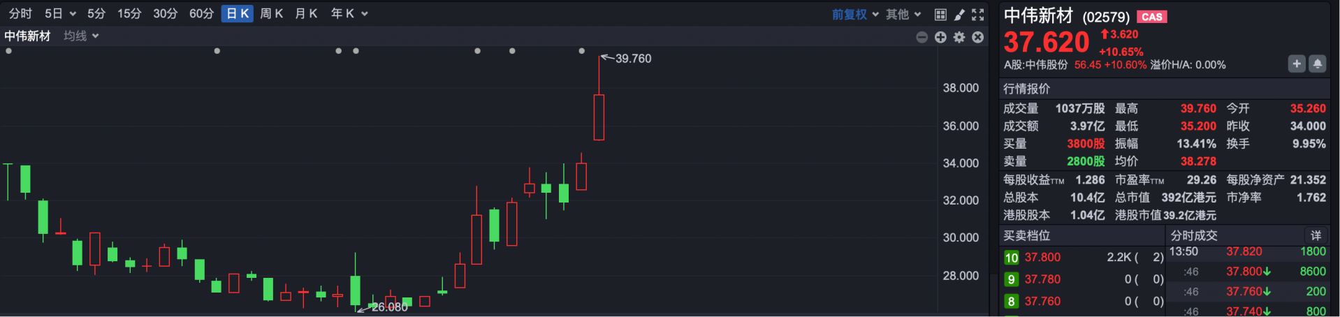 此外,去年11月才在港交所上市的中伟新材(HK02579)可算是赶上了好时机,今天上午涨幅超过11%。中伟新材的发行价为34港元,上市后一度大幅破发,最低跌到了26.08港元,最近两天才终于收复发行价。在镍价大涨的背景下,我认为中伟新材目前的价格并不过分。