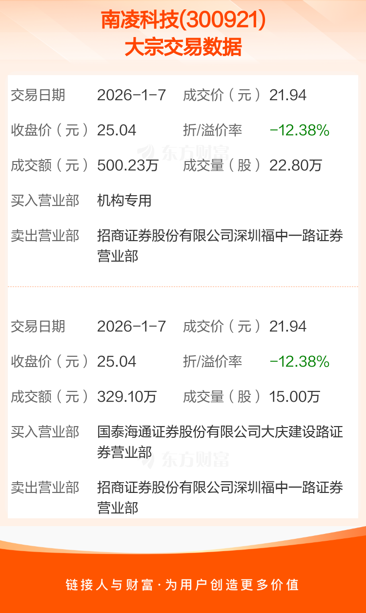 2026年1月7日,南凌科技发生2笔大宗交易,共成交37.80万股,成交金额829.33万元,占其流通市值比例为0.29%。