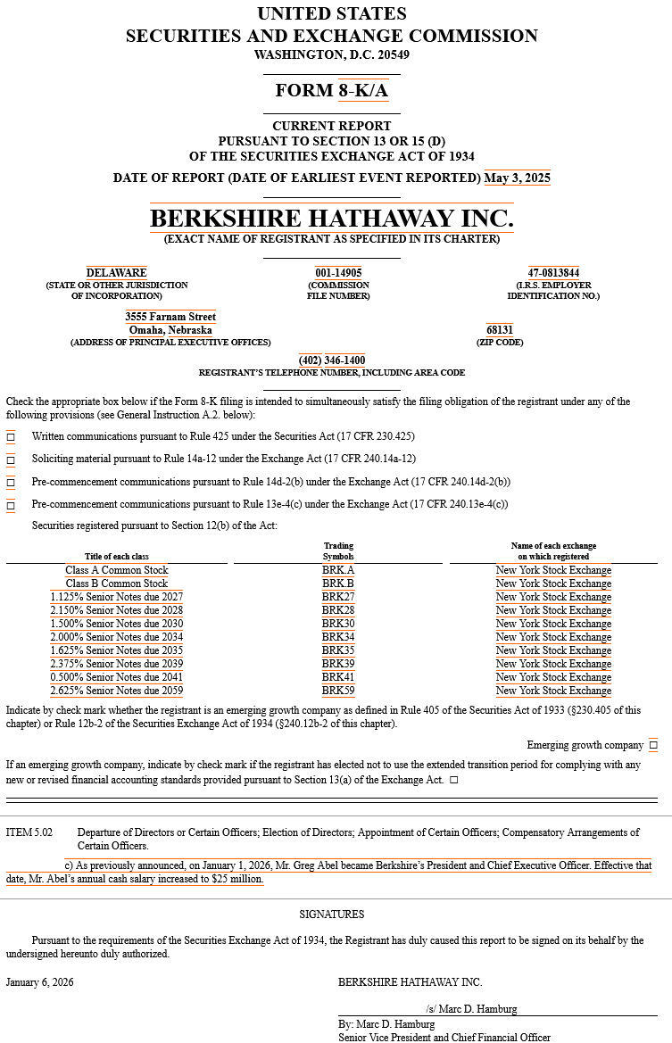 据伯克希尔·哈撒韦(Berkshire Hathaway)当地时间1月6日提交给美国证监会的一份文件显示,格雷格·阿贝尔(Greg Abel)于1月1日正式接替“股神”沃伦·巴菲特(Warren Buffett)成为公司新任CEO,其年薪将增至2500万美元,此次加薪于当日生效。
