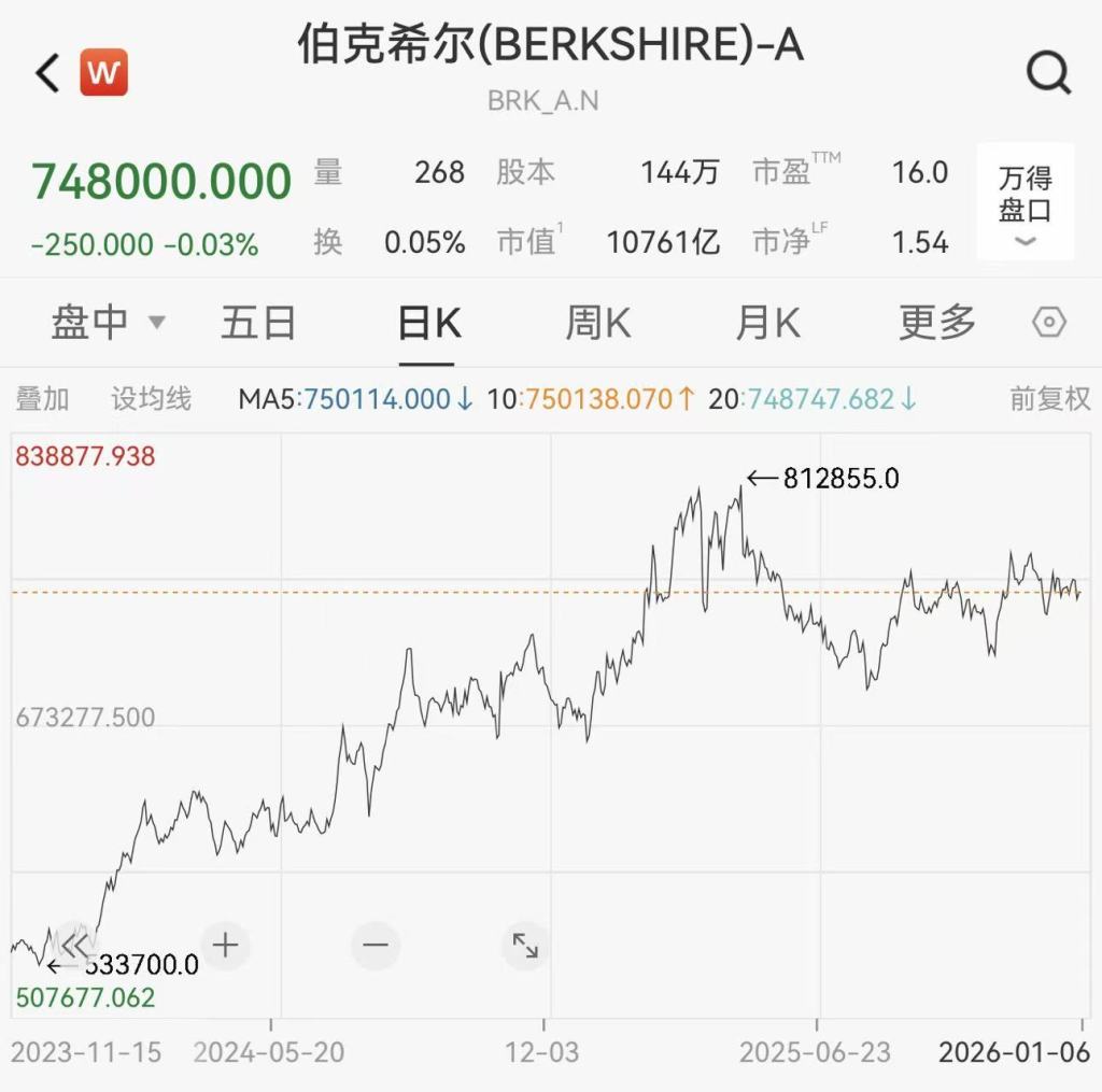 截至1月6日,伯克希尔A类股收盘下跌0.03%,标普500指数上涨0.62%。