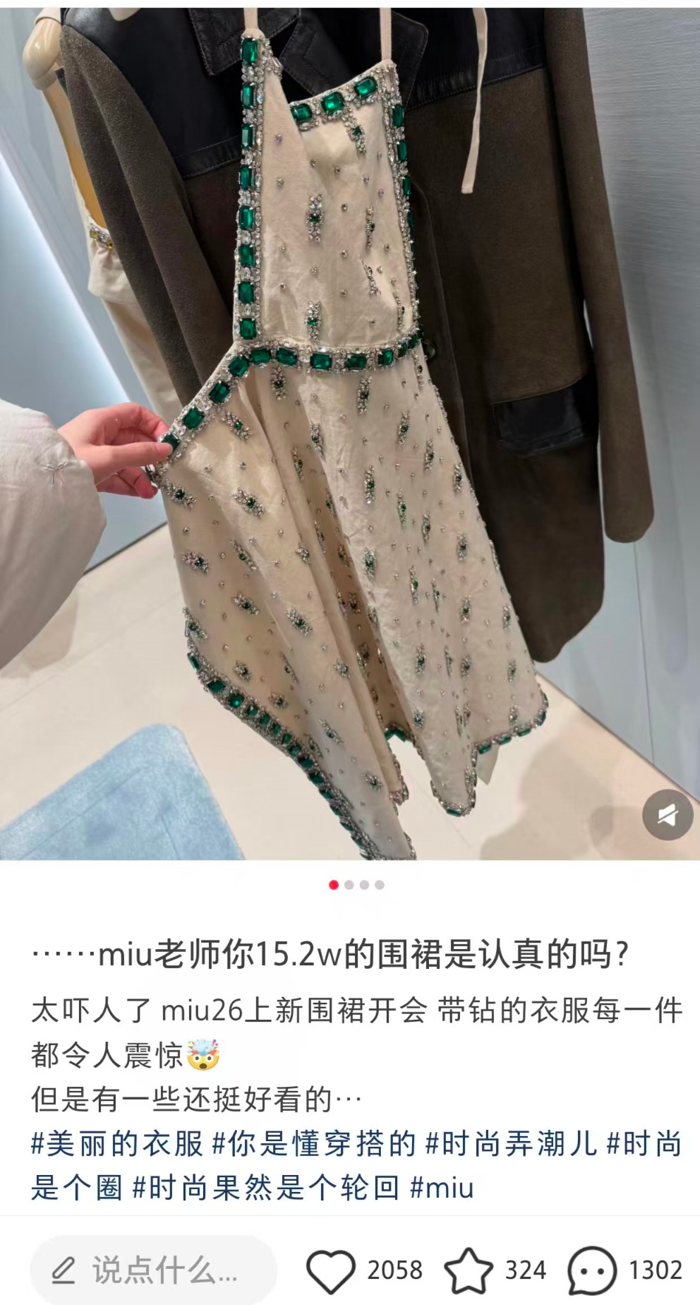 日前,有网友在社交平台发帖称,在一家商场看到miu miu的满钻“围裙”,一条售价高达15.2万元,引发网友热议。