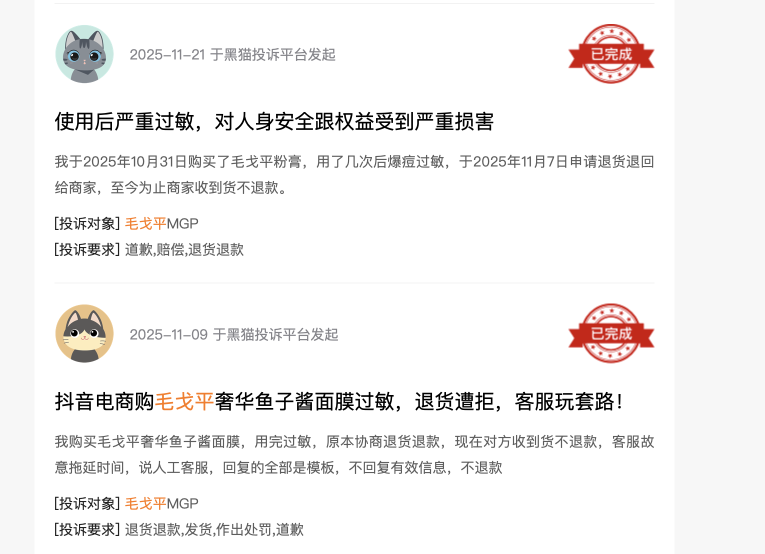 而12315消费者投诉公示平台显示,近一年来有57条关于毛戈平质量和安全问题的投诉,而黑猫投诉平台上则有多条消费者使用毛戈平产品后出现严重过敏症状的投诉。