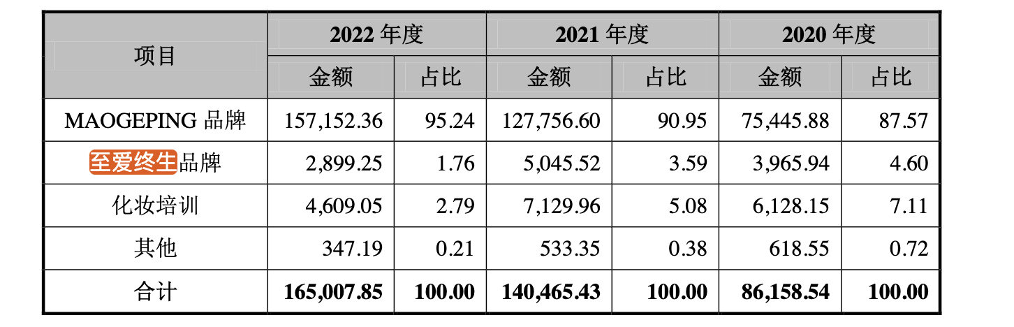 毛戈平公司高毛利生意背后,是其高度依赖创始人IP的高端主品牌“MAOGEPING”。根据招股书,毛戈平公司收入超过95%依赖于主品牌毛戈平,而毛戈平公司主品牌创立于2000年,已经是一个经营超25年的美妆“老人”。担心单一品牌依赖症的毛戈平,毅然开发了新品牌“至爱终生”,但目前来看,第二品牌至爱终生的发展远不如主品牌,收入只有数千万,还呈现逐渐下滑的趋势。