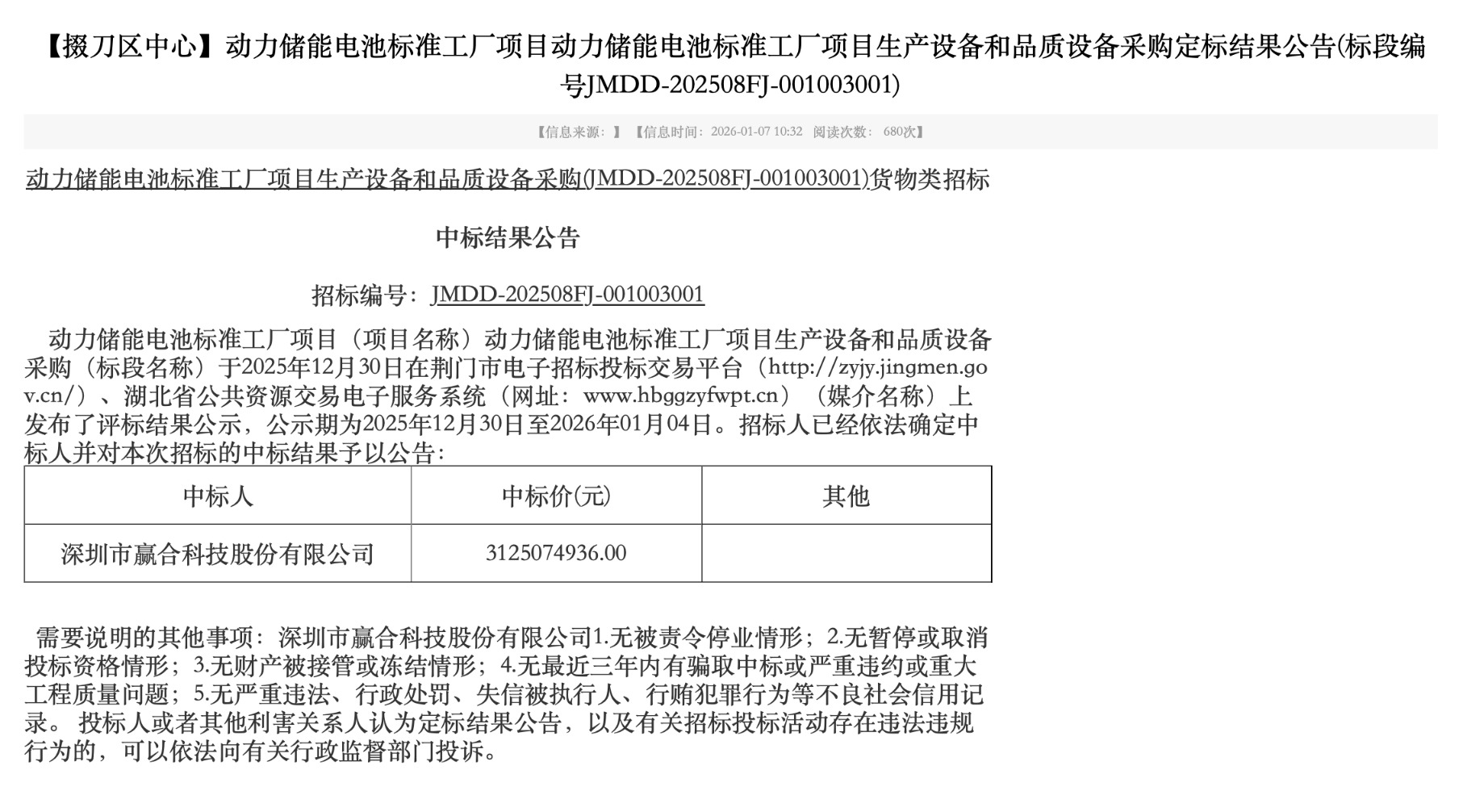 荆门市电子招标投标交易平台发布《动力储能电池标准工厂项目动力储能电池标准工厂项目生产设备和品质设备采购定标结果公告》。招标人为荆门亿纬新能源科技有限公司。中标人为深圳市赢合科技股份有限公司,中标价为31.25亿元。