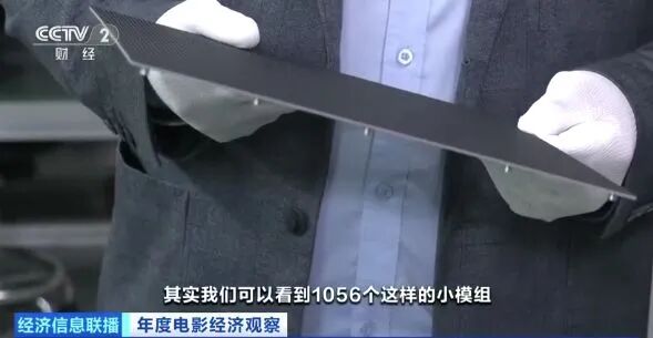 华夏利亚德(北京)电影科技有限公司首席技术官王加志:14米宽标准电影屏的最小模组,在整个屏里,可以看到1056个这样的小模组,由它拼成一块完整的14米电影屏。这个灯是一毫米左右的,灯与灯之间的点间距是3.3毫米。