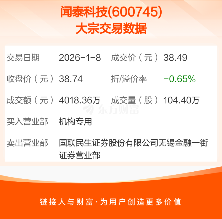 2026年1月8日,闻泰科技发生1笔大宗交易,共成交104.40万股,成交金额4018.36万元,占其流通市值比例为0.08%。