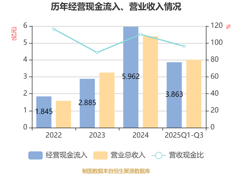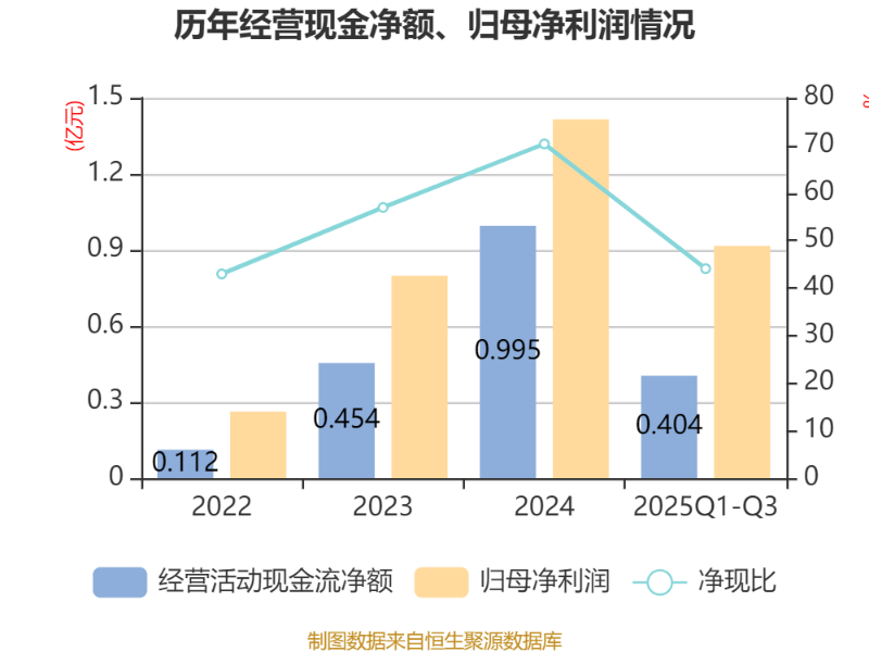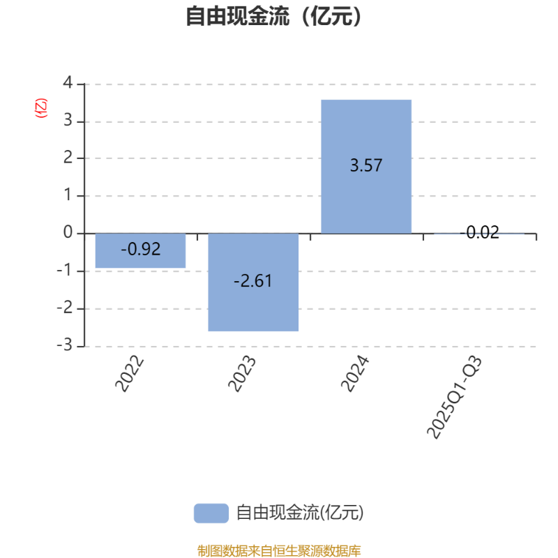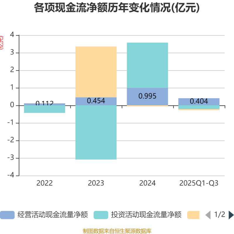2025年前三季度,公司经营活动现金流净额为4035.03万元,同比下降44.22%;筹资活动现金流净额-577.22万元,同比减少144.11万元;投资活动现金流净额-2180.62万元,上年同期为2.87亿元。