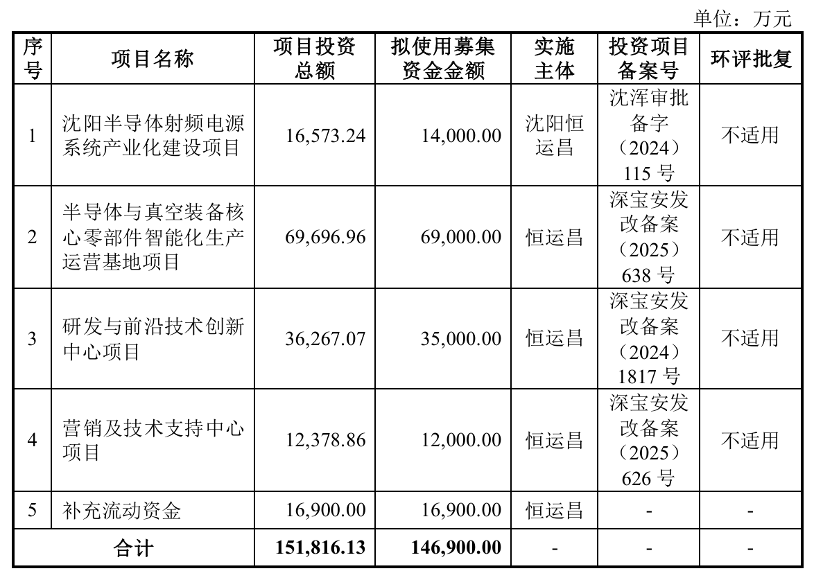 中证智能财讯 恒运昌(688785)1月8日披露招股意向书,计划公开发行1693.06万股,占发行后总股本的25.01%,拟募集资金14.69亿元用于沈阳半导体射频电源系统产业化建设、半导体与真空装备核心零部件智能化生产运营基地、研发与前沿技术创新中心、营销及技术支持中心,以及补充流动资金。本次发行的申购日期1月16日。