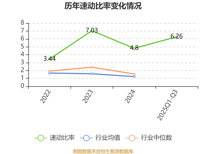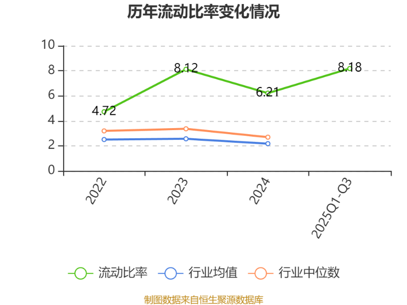 2024年,公司流动比率为6.21,速动比率为4.8。2025年前三季度,公司流动比率为8.18,速动比率为6.26。