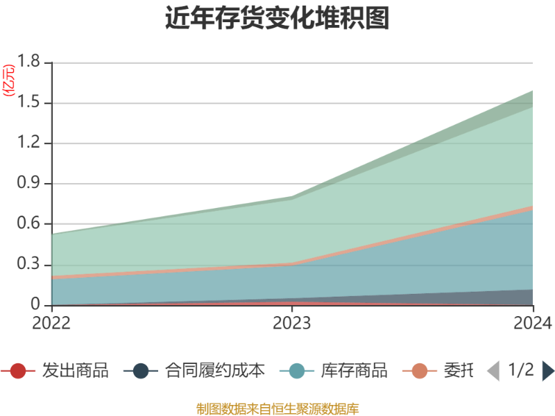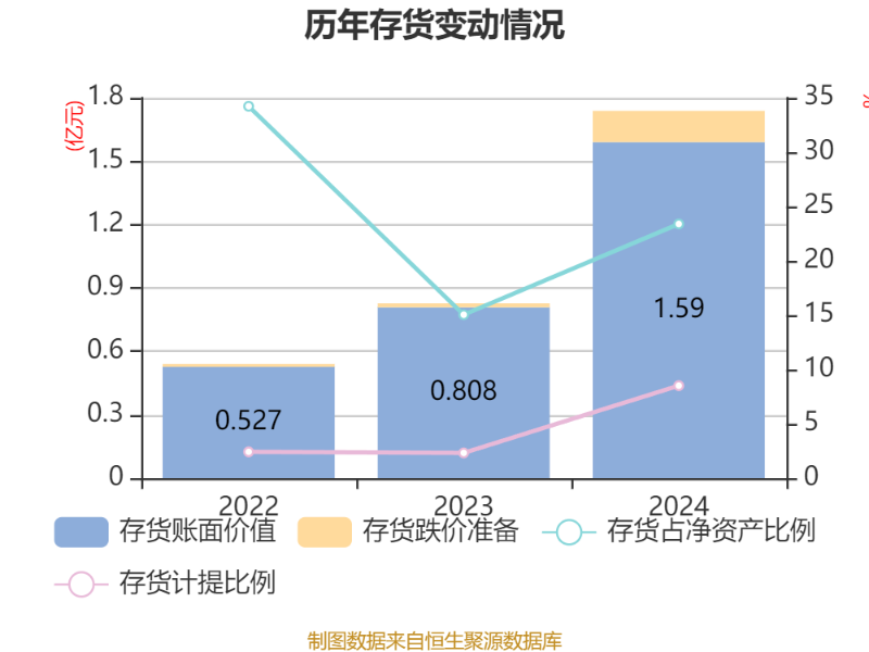 从存货变动来看,截至2024年末,公司存货账面价值为1.59亿元,占净资产的23.39%,较上年末增加7826.24万元。其中,存货跌价准备为1480.18万元,计提比例为8.51%。