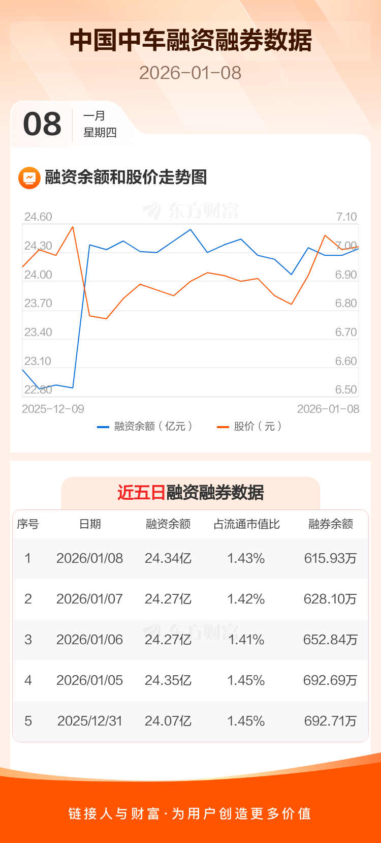 交易所最新数据显示,中国中车于2026年1月8日获融资买入6907.82万元,融资偿还6257.86万元,当日融资净买入649.96万元。目前,该股融资余额24.34亿,占流通市值比例为1.43%。