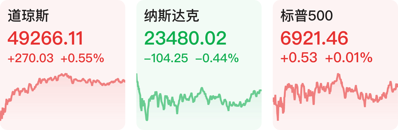 美股三大指数收盘涨跌不一,道指涨0.55%,标普500指数涨0.01%,纳指跌0.44%。大型科技股多数下跌,英特尔跌超3%,英伟达跌逾2%,微软跌超1%,奈飞、苹果小幅下跌;谷歌、亚马逊、特斯拉涨超1%。存储概念普跌,希捷科技跌超7%,西部数据跌超6%,闪迪跌超5%,美光科技跌超3%。热门中概股多数上涨,纳斯达克中国金龙指数涨1.09%。哔哩哔哩涨逾6%,腾讯音乐、阿里巴巴涨超5%,金山云、小鹏汽车等涨超3%,京东、唯品会等涨超2%;百度、霸王茶姬跌超3%,蔚来跌超1%。