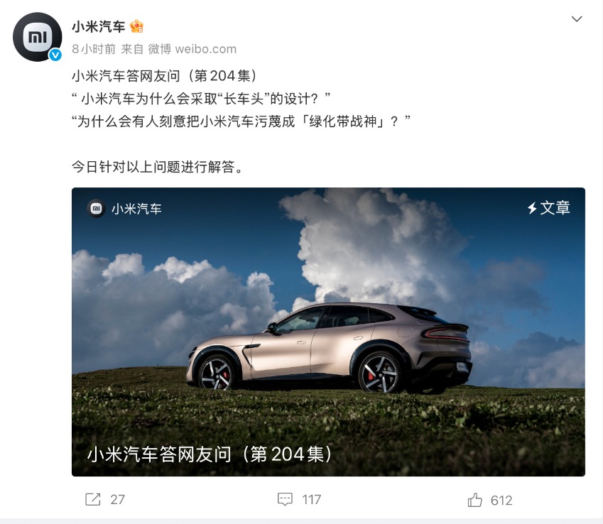 1月8日深夜,小米汽车官微发布《小米汽车答网友问(第204集)》,再次集中回应外界的诸多疑问。